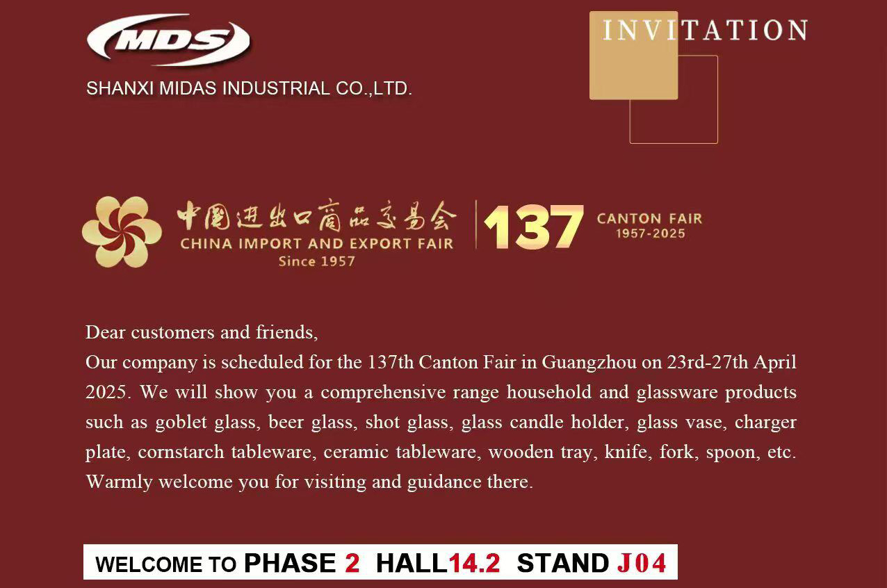 Nuestra compañía está programada para la feria de cantón 137 en Guangzhou, del 23 al 27 de abril de 2025. Le mostraremos una amplia gama de productos para el hogar y cristal, tales como vidrio copa, vidrio de cerveza, vidrio de tiro, titular de vela de vidrio, jarrón de vidrio, placa de carg, vajde almidón de maíz, vajde cerámica, bandeja de madera, cuchillo, tenedor, cuchar, etc... |