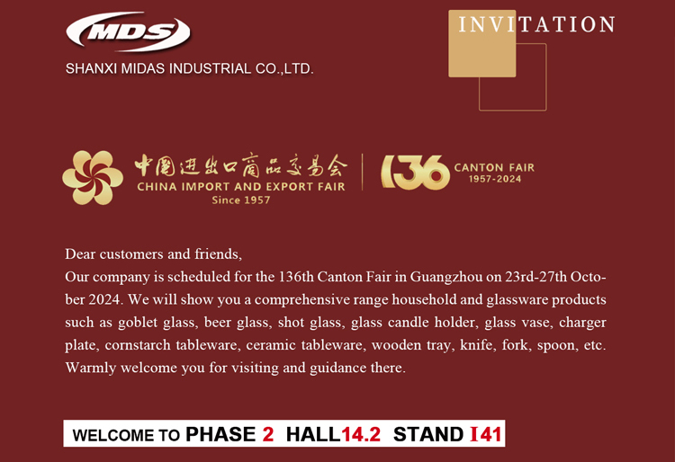 Estimados clientes y amigos, estamos muy contentos de anunciar que nuestra empresa participará en la 136a feria de cantón, programada para 23 a 27 de octubre de 2024. En este gran evento, presentaremos los exquisiproductos de nuestra compañía de una manera profesional, incluyendo copa de vidrio, jarrones de vidrio, vajilla de cerámica, bandejde de madera, y mucho más... |